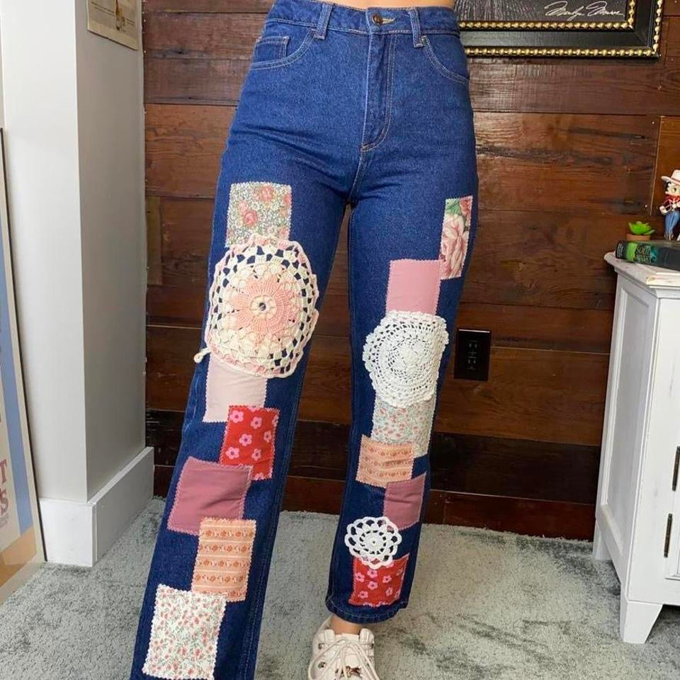 Handmade pink theme patchwork & vintage doilies high waisted jeans
